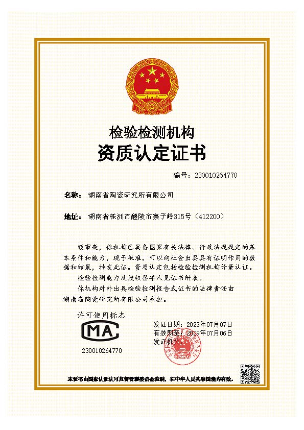 陶研所检测站成立于1981年,同年5月经湖南省原标准局、原轻工业局批准为“湖南省陶瓷产品质量监督检验授权站”,1991年10月经国家轻工业部批准为“国家轻工业陶瓷质量监督检测醴陵站”。随着陶研所的机制改革,检测站虽经历了几次更名,但一直保持国有属性不变,一直为企业提供公正、准确的检测服务。2023年检测站资质到期换证评审,开始以法人单位“湖南省陶瓷研究所有限公司”名义向省市场监管局和中国轻工业联合会申请资质认定评审。 1、省站CMA 机构名称:湖南省陶瓷研究所有限公司 获证编号:231821342498 有效期:2023年3月7日~2029年3月6日 批准部门:湖南省市场监督管理局 2、国家行业站CMA 机构名称:湖南省陶瓷研究所有限公司 获证编号:230010264770 有效期:2023年7月7日~2029年7月6日 批准部门:国家认证认可监督管理委员会
