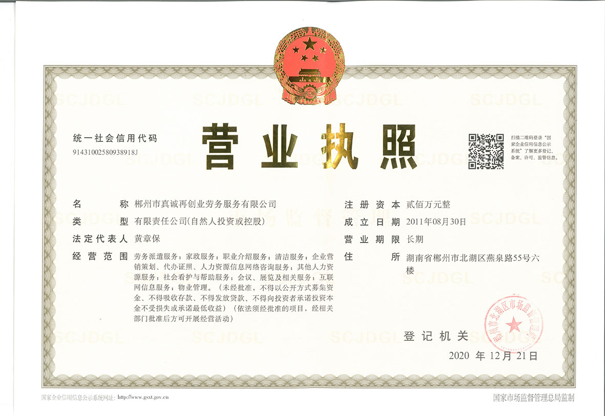郴州市真诚再创业劳务服务有限公司是一家专注于中小微企业全链条服务的专业化机构,具备独立法人资格,运营规范、信用良好。公司以“真诚服务、助力创业、赋能企业”为核心宗旨,整合人力资源、后勤保障、营销策划等多元服务资源,构建了涵盖劳务派遣、职业介绍、家政服务、清洁服务、企业营销策划、代办证照、人力资源咨询、会议展览、物业管理等一站式服务体系。